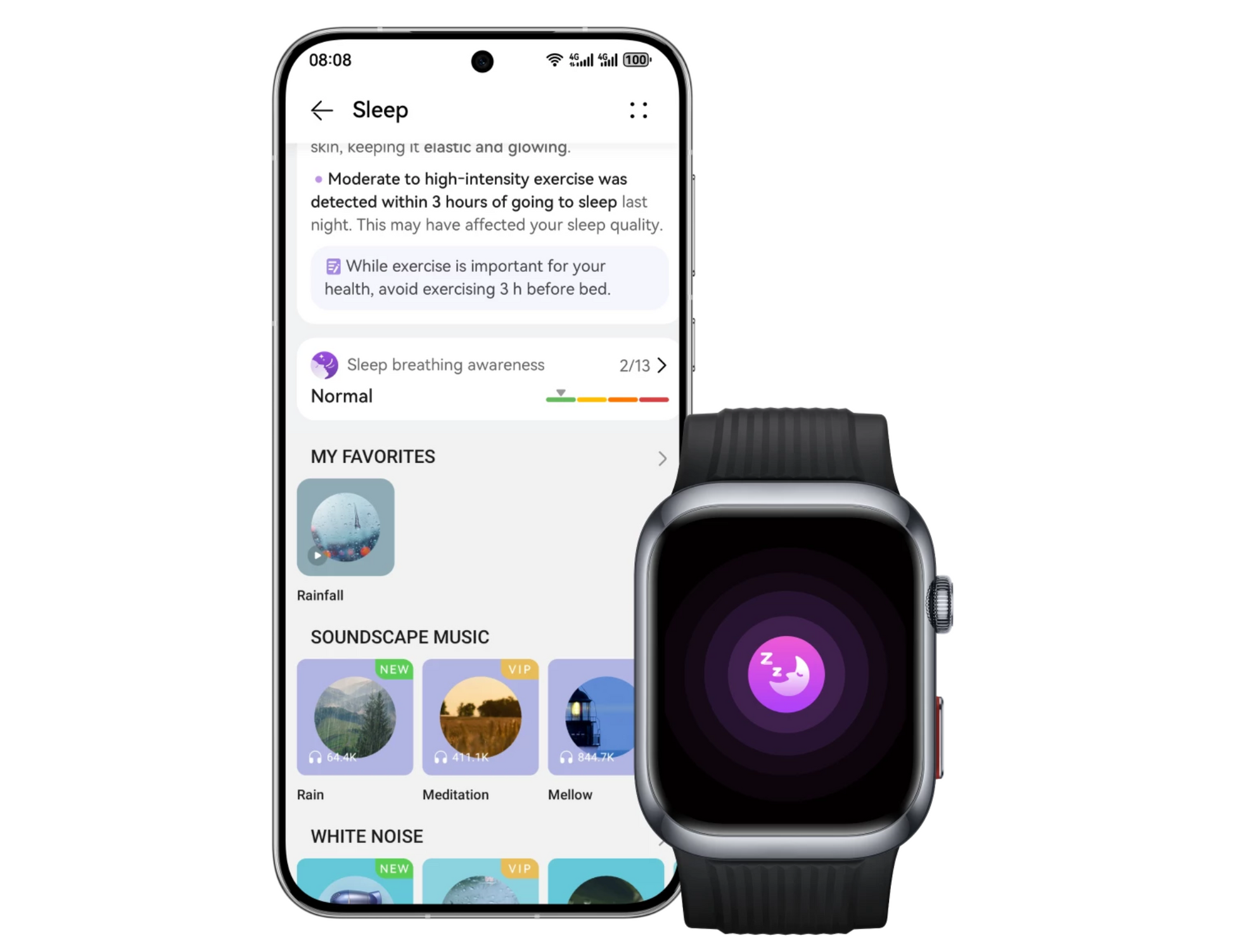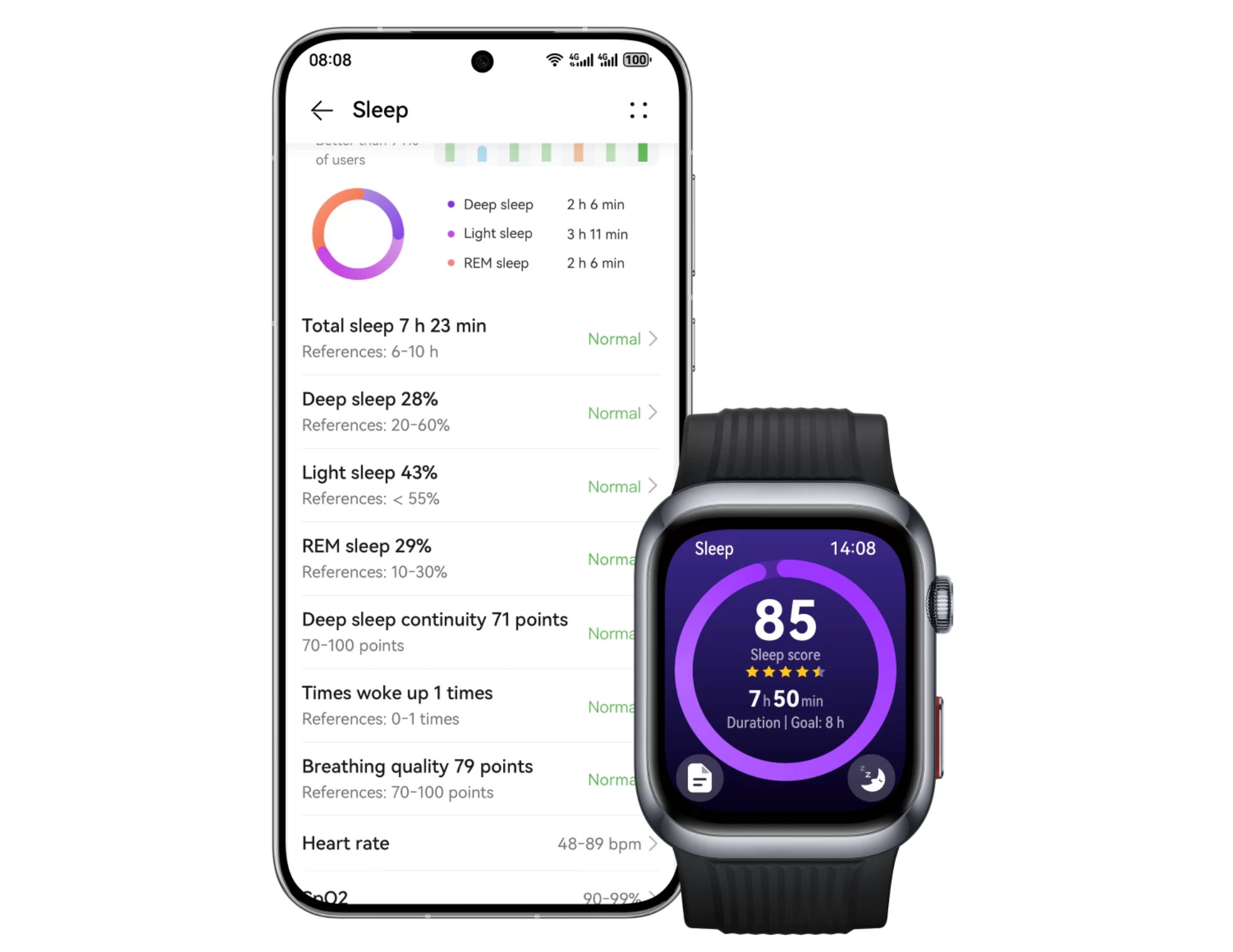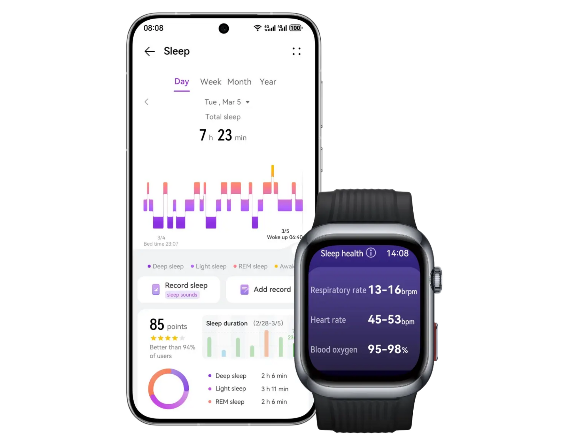- إدارة النوم والإجهاد: توفر تقنية HUAWEI TruSleep™ تتبعًا دقيقًا للنوم، بينما تساعد مراقبة الإجهاد على مدار 24 ساعة مع تمارين التنفس في الحفاظ على التوازن.