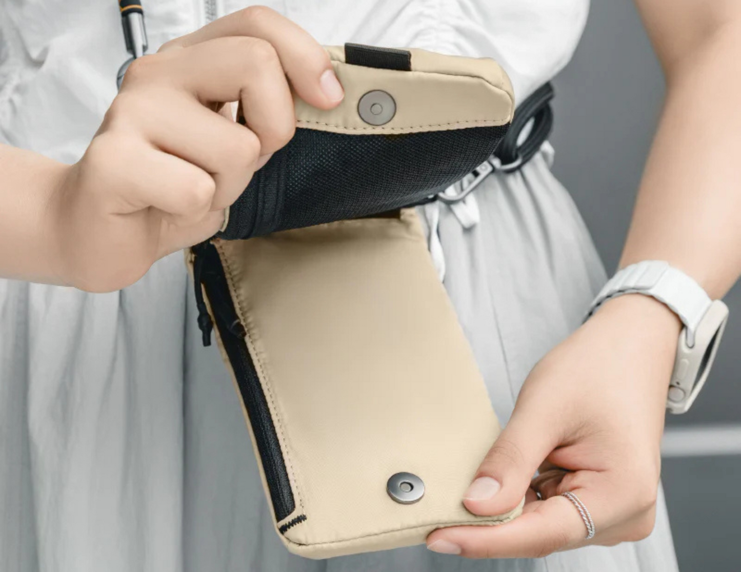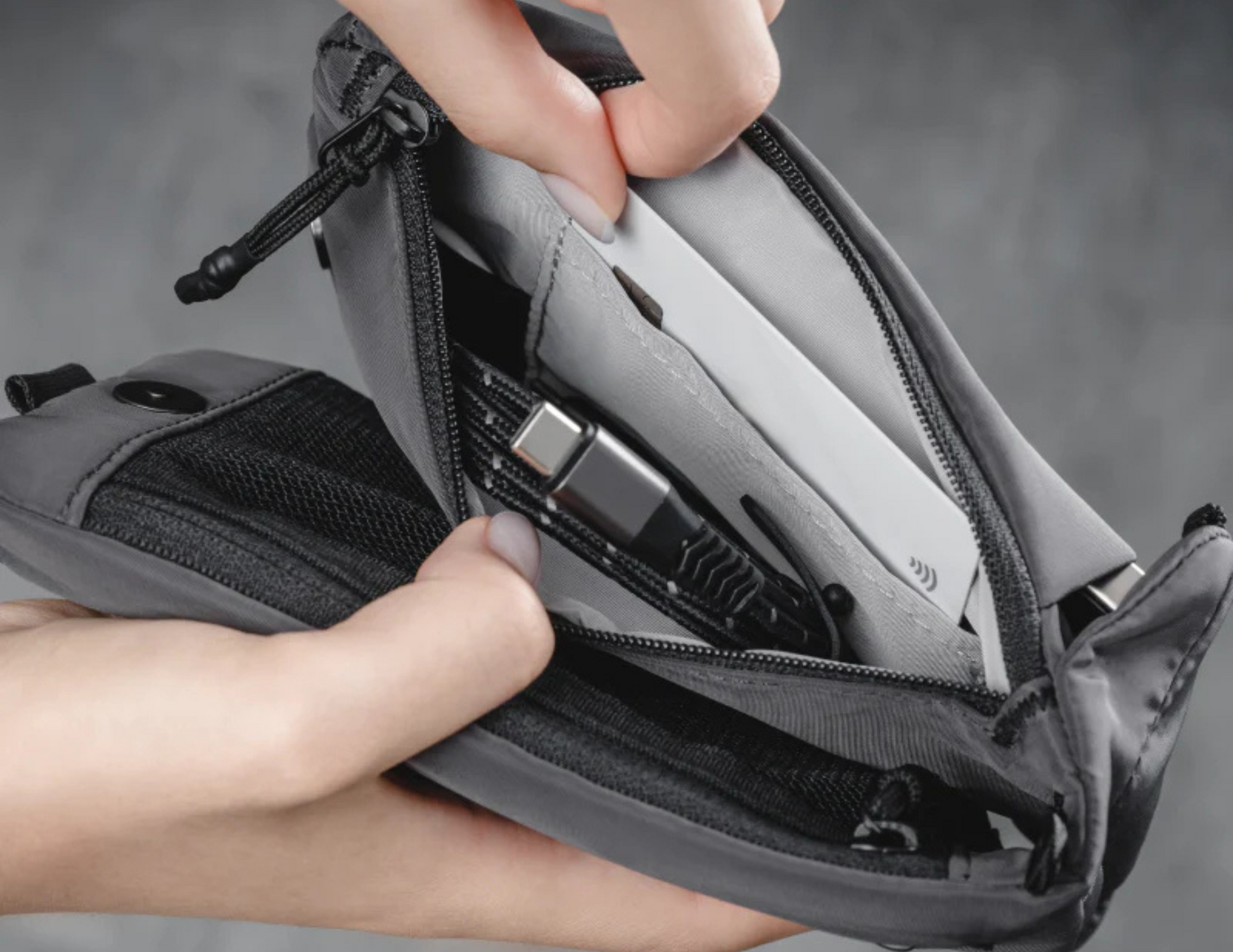 - مميزات خاصة: جيب للهاتف يمكن الوصول إليه بسرعة، وفتحة بطاقة يمكن النقر عليها والتنقل بها، وحزام للمفاتيح
