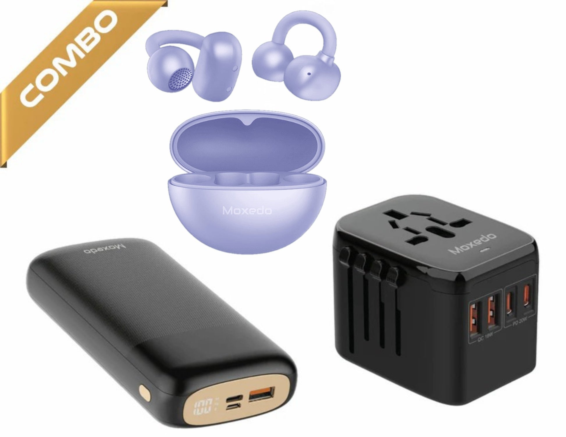 مجموعة موكسيدو التقنية للسفر - سماعات أذن مفتوحة + محول عالمي بقوة ٢٠ واط + بنك طاقة بقوة ٢٠٠٠٠ مللي أمبير/ساعة