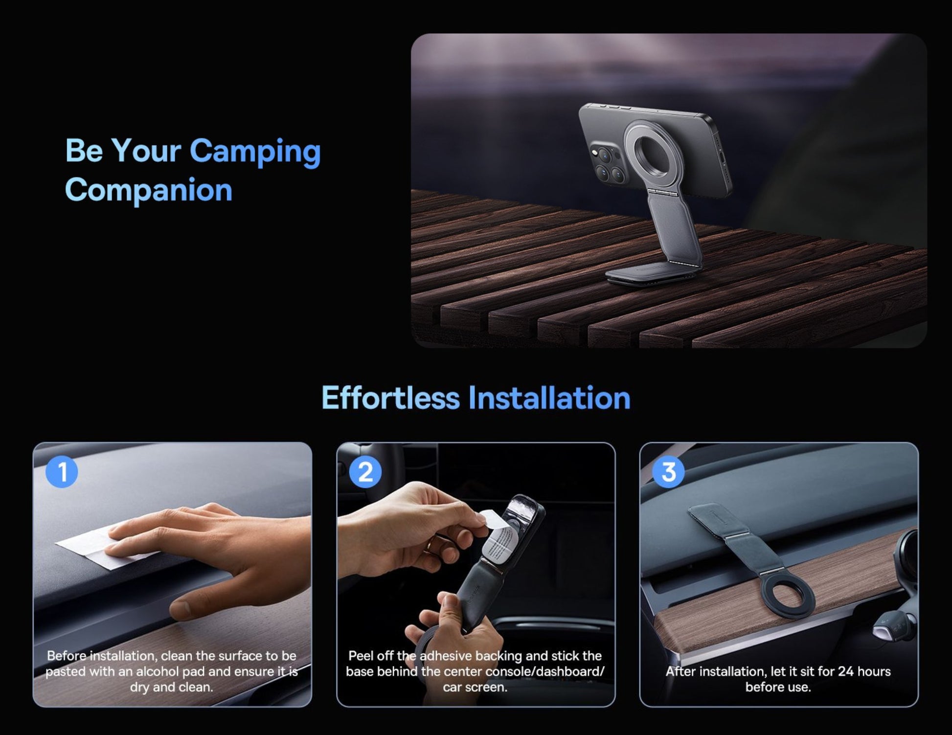 ✅ Bendable Stick-On Base — Flexible for flat or curved dashboards.