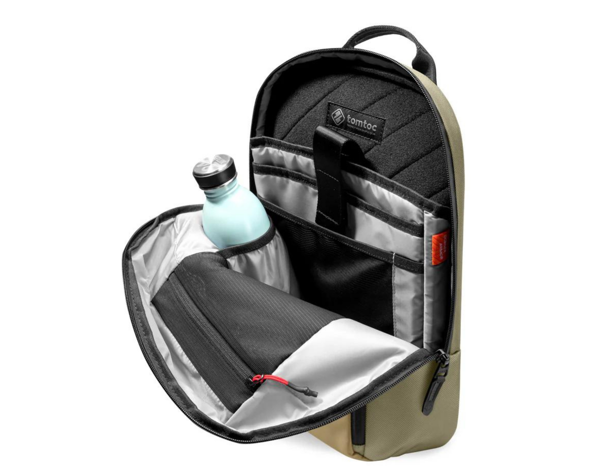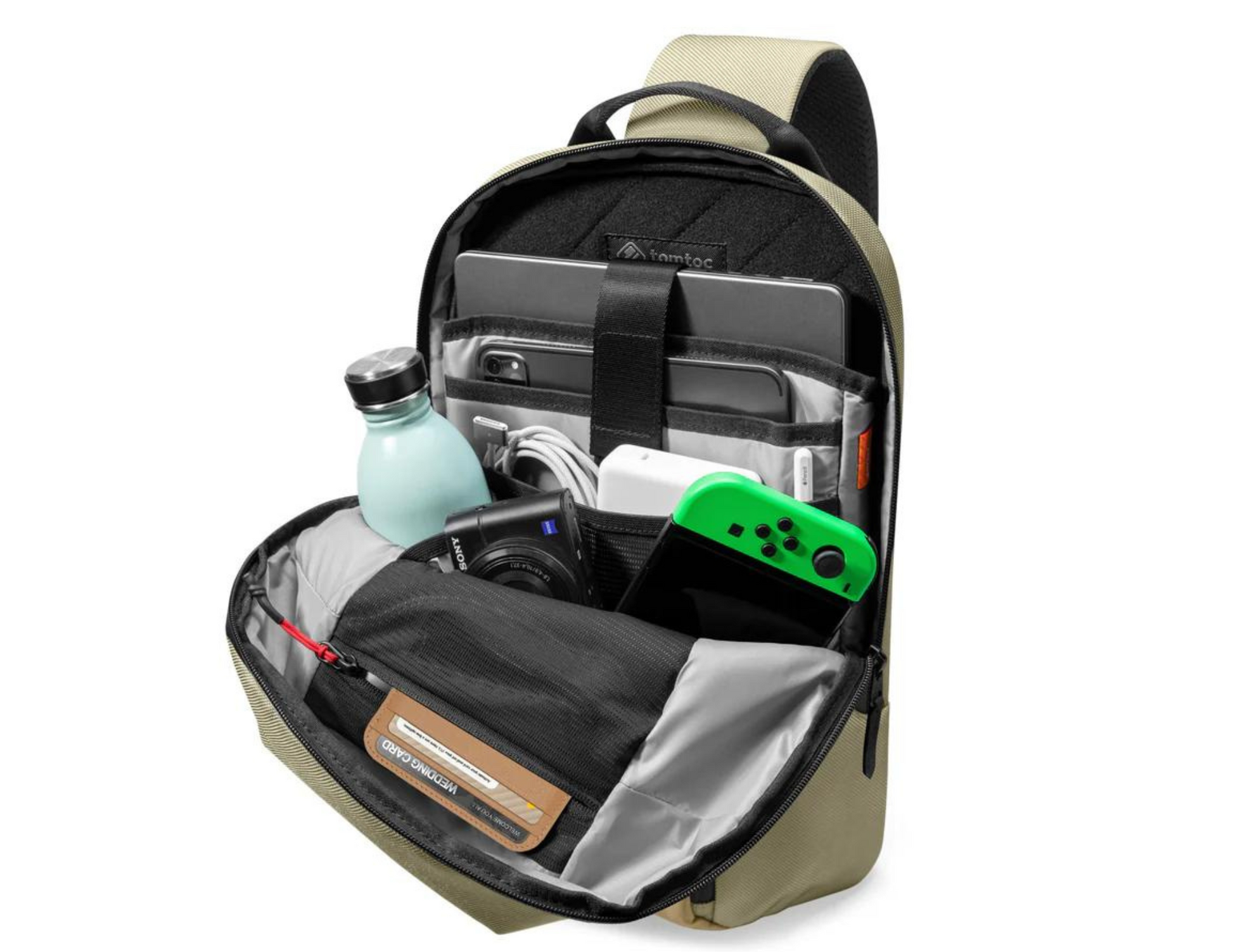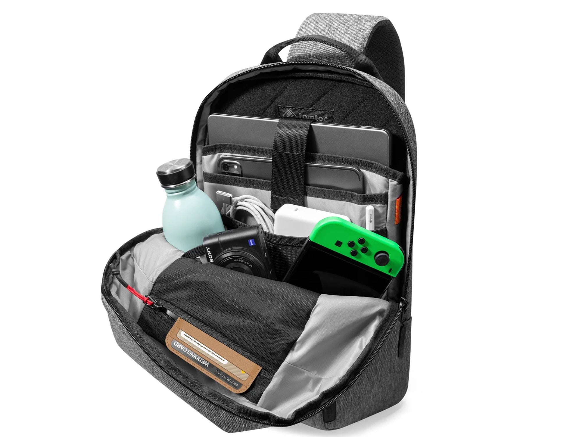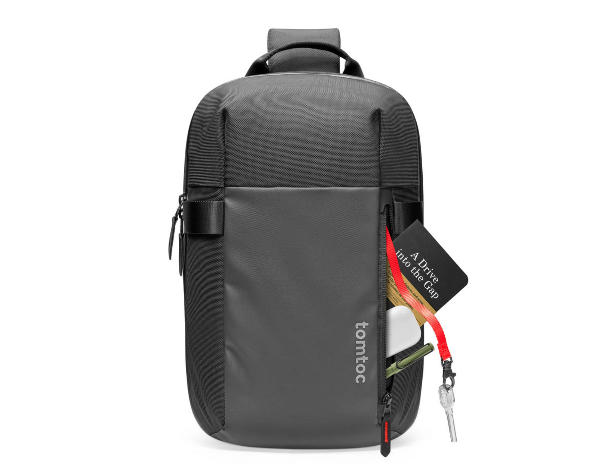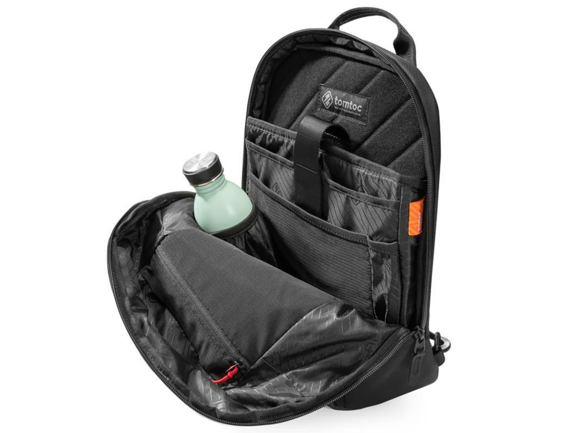 The Tomtoc Navigator-T24 features multiple large and small pockets to keep your belongings safe and organized. It includes a padded laptop pocket, a tablet pocket, and side pockets for bottles. The quick-access front pocket with a key strap keeps your daily essentials within easy reach.