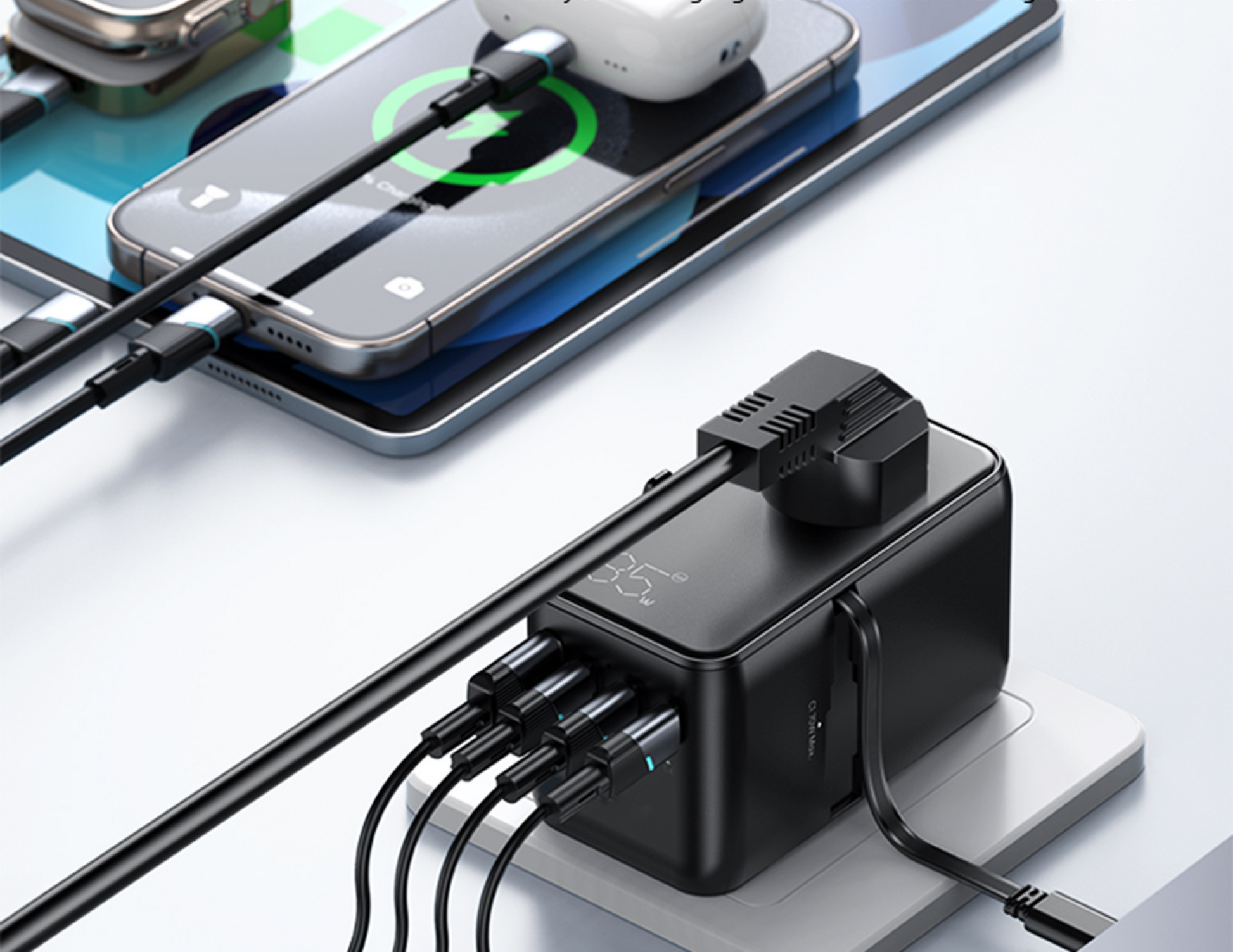 This travel adapter supports up to 85W fast charging, providing the power needed to quickly charge laptops and other high-demand devices. With GaN technology, it efficiently delivers power while maintaining a compact and lightweight design.